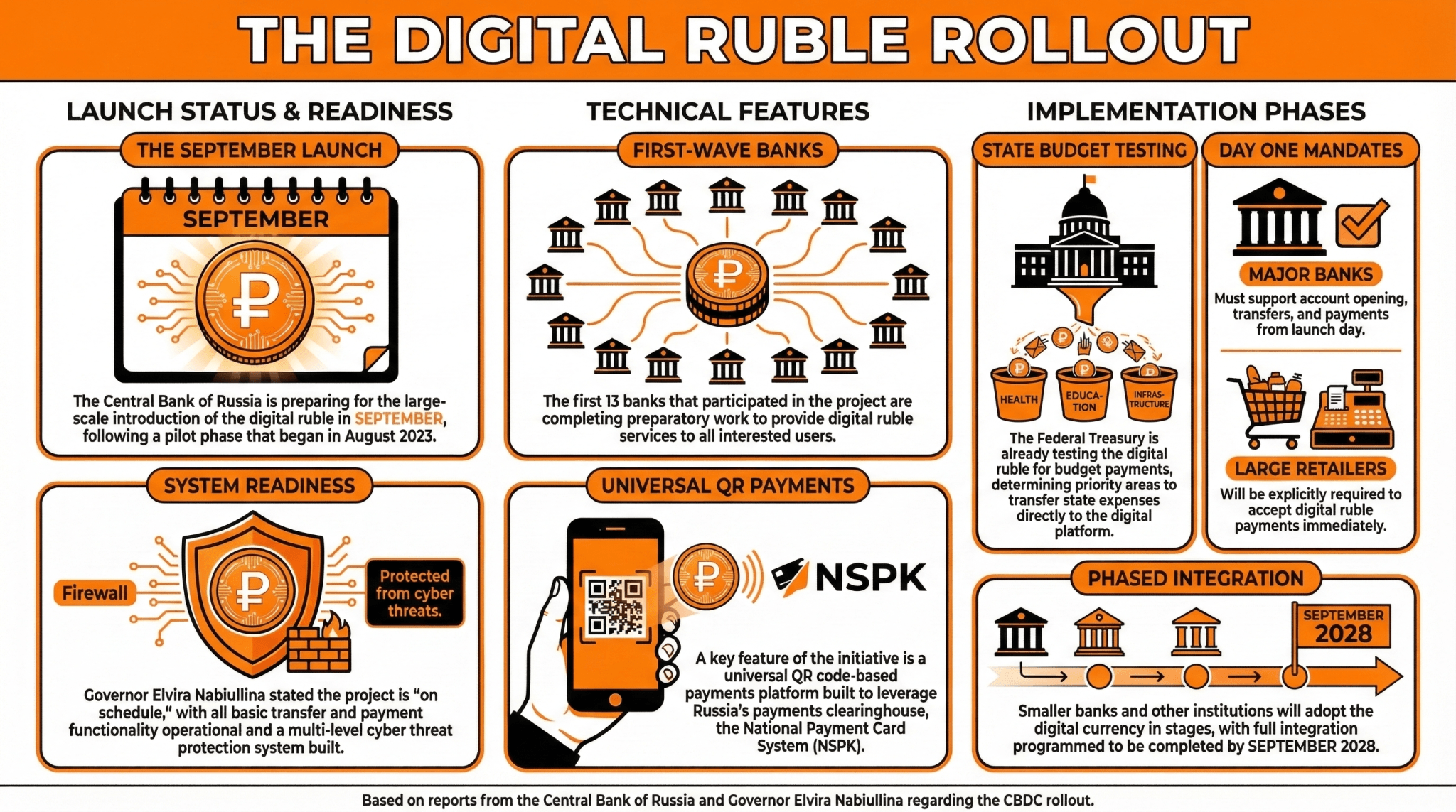 Major banks must support digital ruble operations from launch day, while smaller banks will begin integration gradually, achieving full integration by September 2028.
