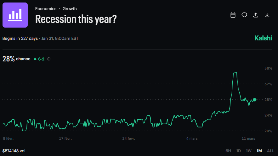 Meanwhile, Kalshi traders are now predicting a 28% chance that the United States will plunge into a recession in 2026, down from recent highs of 34–36%.