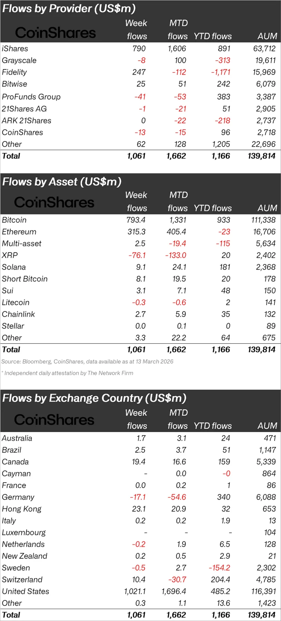 “Bitcoin accounted for 75% of total inflows, reaching $793 million, and three-week inflows totaled $2.2 billion.”