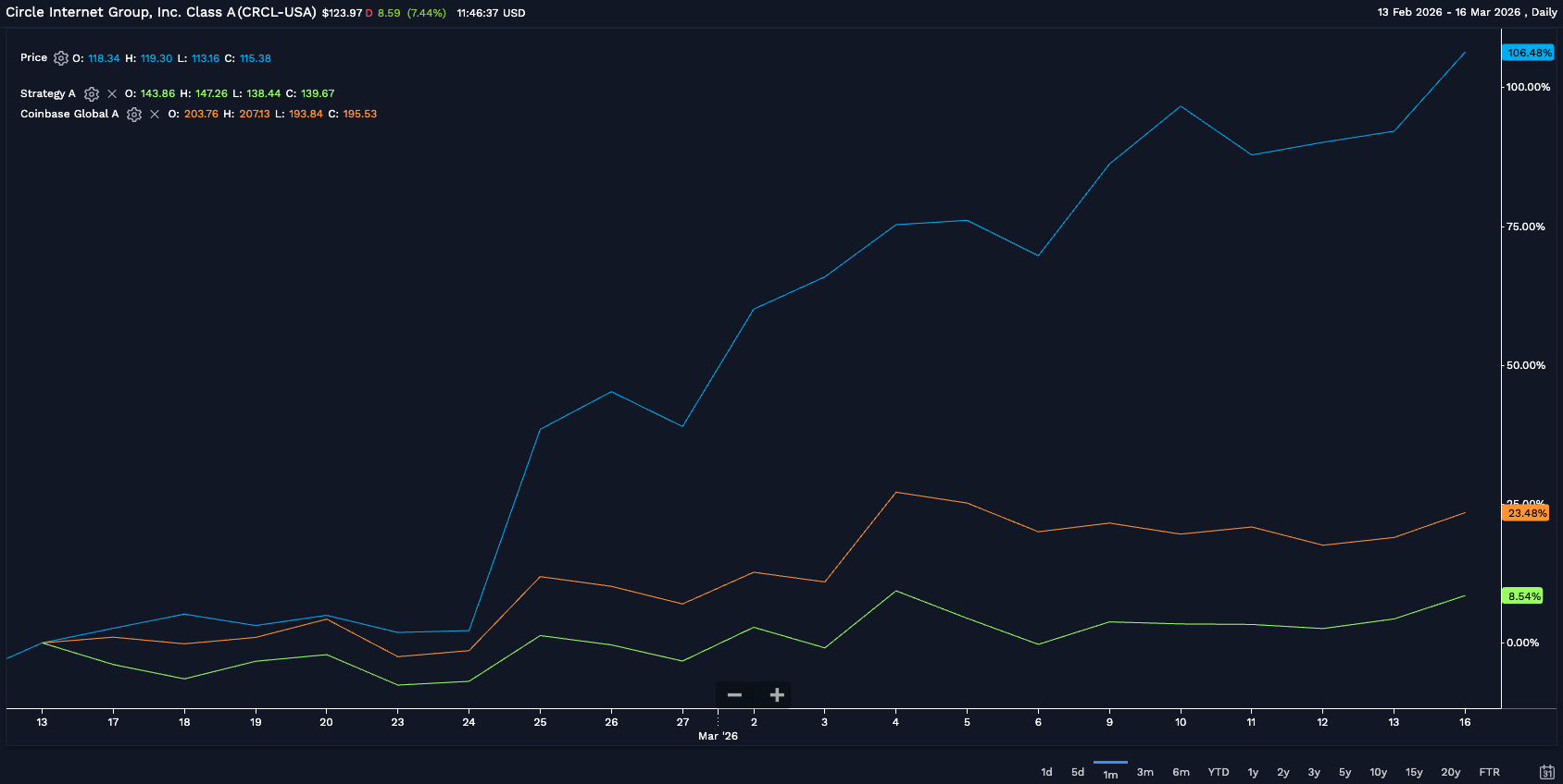 Shares of stablecoin issuer Circle (CRCL) have surged more than 100% over the past month, turning what many investors once viewed as one of the most conservative corners of crypto into one of the market’s hottest trades.