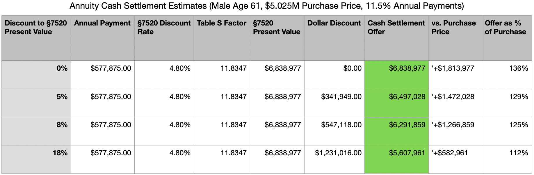 The practical negotiating range is roughly $6 million, corresponding to the 5-10% discount rate band that dominates the annuity “settlements” bids.