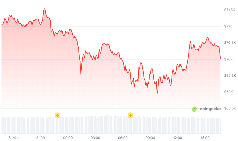 Bitcoin (BTC) is trading at around $70,000, down 1.3% over the past 24 hours. $ETH and SOL fell 2% to $2,135 and $88.5, respectively. Meanwhile, Ripple (XRP) slipped 1%.