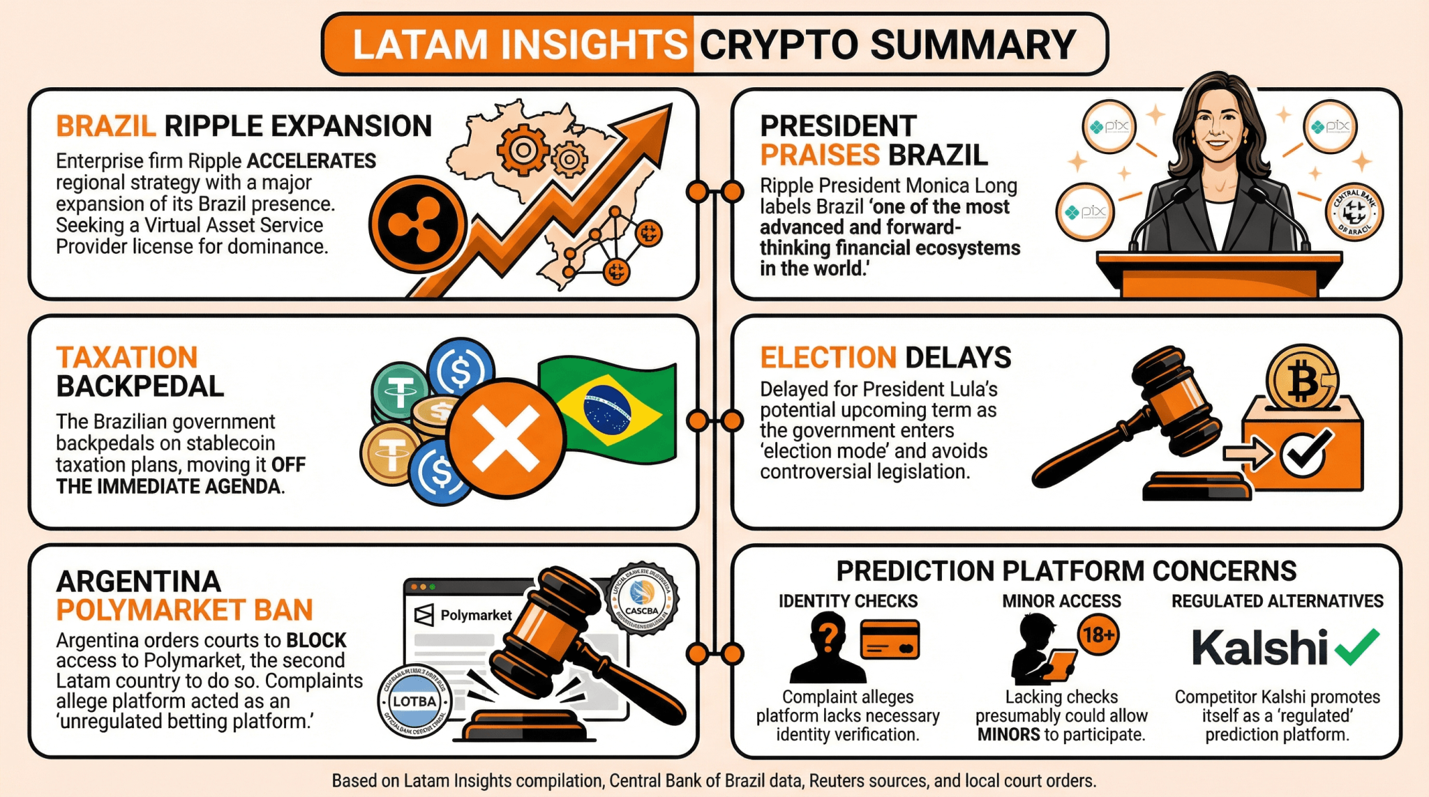 Welcome to Latam Insights, a compilation of the most relevant crypto news from Latin America over the past week. In this edition, Ripple makes moves to accelerate its expansion into Brazil, the Brazilian government is reportedly backpedaling on its crypto taxation plans, and Argentina bans access to Polymarket.