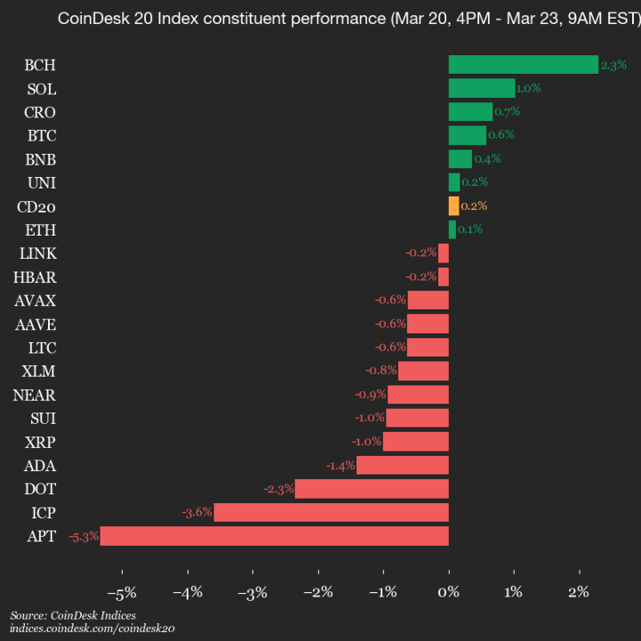 Leaders: BCH (+2.3%) and SOL (+1.0%).