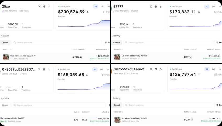 On-chain data shows that four newly created wallets generated about $663,000 in combined profit by betting “YES” on a ceasefire occurring by April 7.