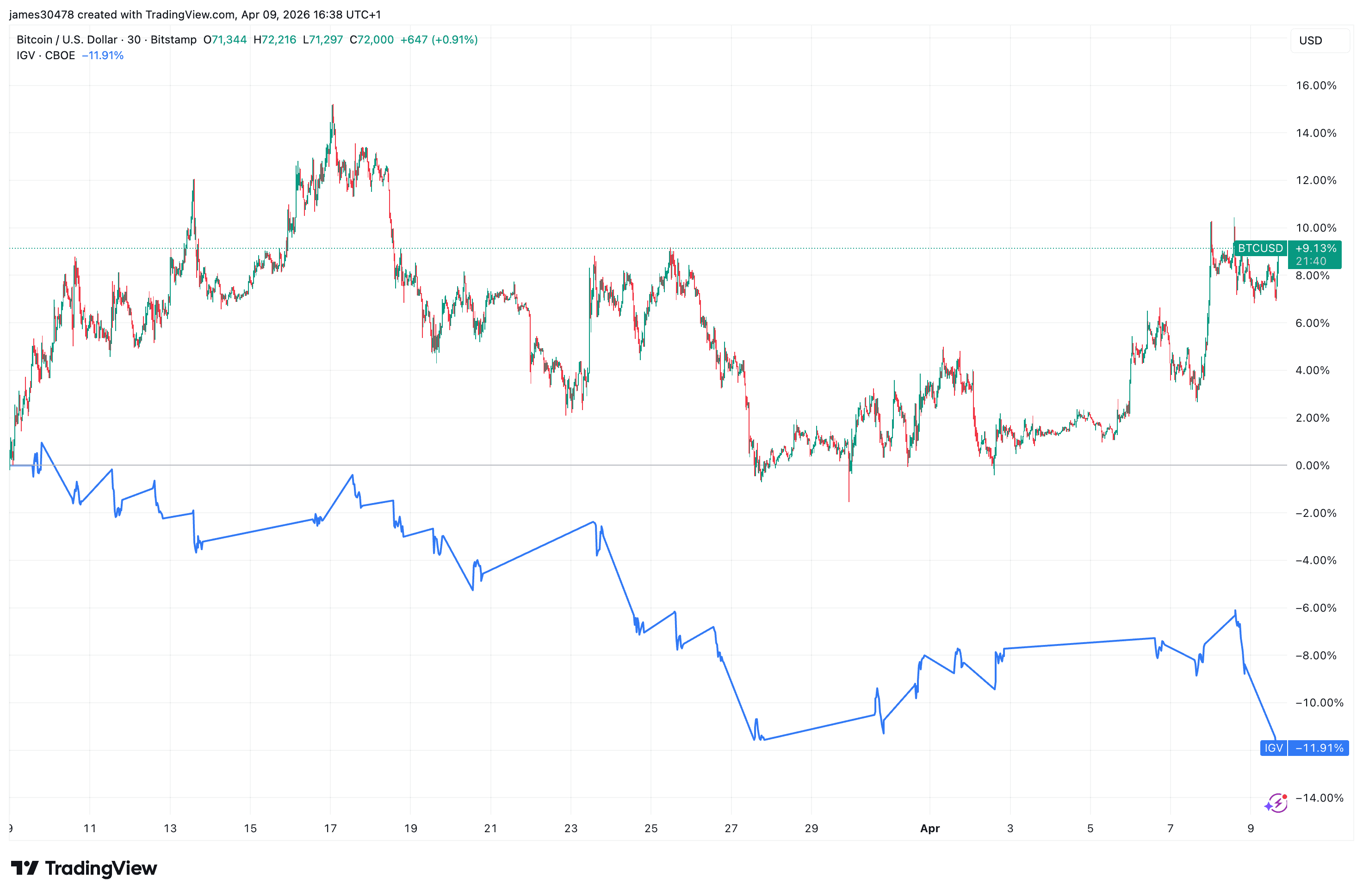 Over the past month, bitcoin is up 9%, while IGV is down 12%.