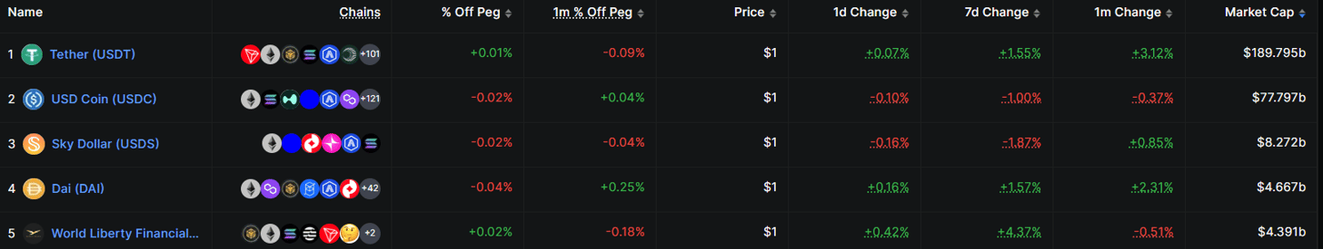Tether's USDt ($USDT) leads with a market cap of more than $189.7 billion, followed by Circle's $USDC ($USDC) at $77.7 billion and Sky Dollar at $8.2 billion, according to DeFi analytics platform DefiLlama.
