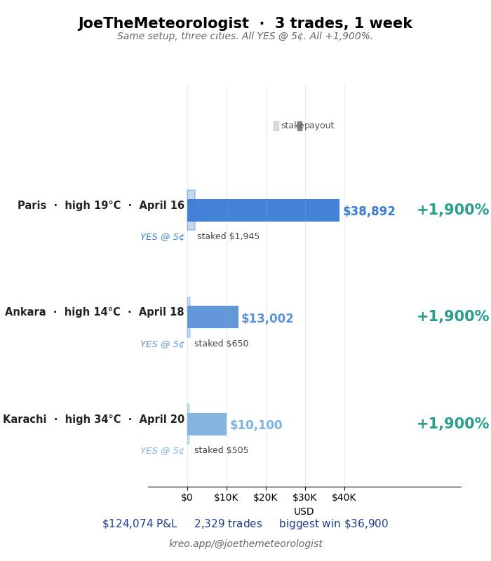 In one instance, on-chain data indicates that one trader on April 26 converted $505 into $10,100 on a Karachi high-temperature bucket priced at $0.5, then repeated similar 1,900% gains on Paris and Ankara bets within the same week.