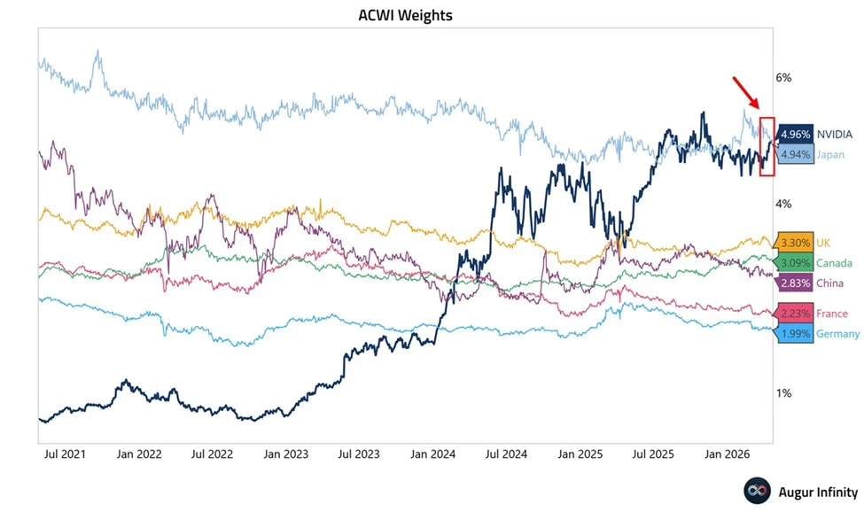 As a result, the chipmaker now commands a larger share than entire national markets tracked by ACWI, as shown by new Augur Infinity data posted by The Kobeissi Letter.