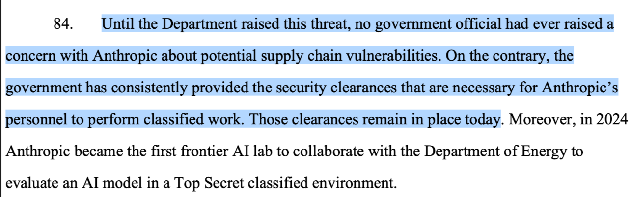 In this lawsuit, Anthropic says that despite the supply chain risk designation issued the other week, their personnel still have security clearances "that are necessary for Anthropic’s personnel to perform classified work" pic.twitter.com/6EZZ7ngiVF