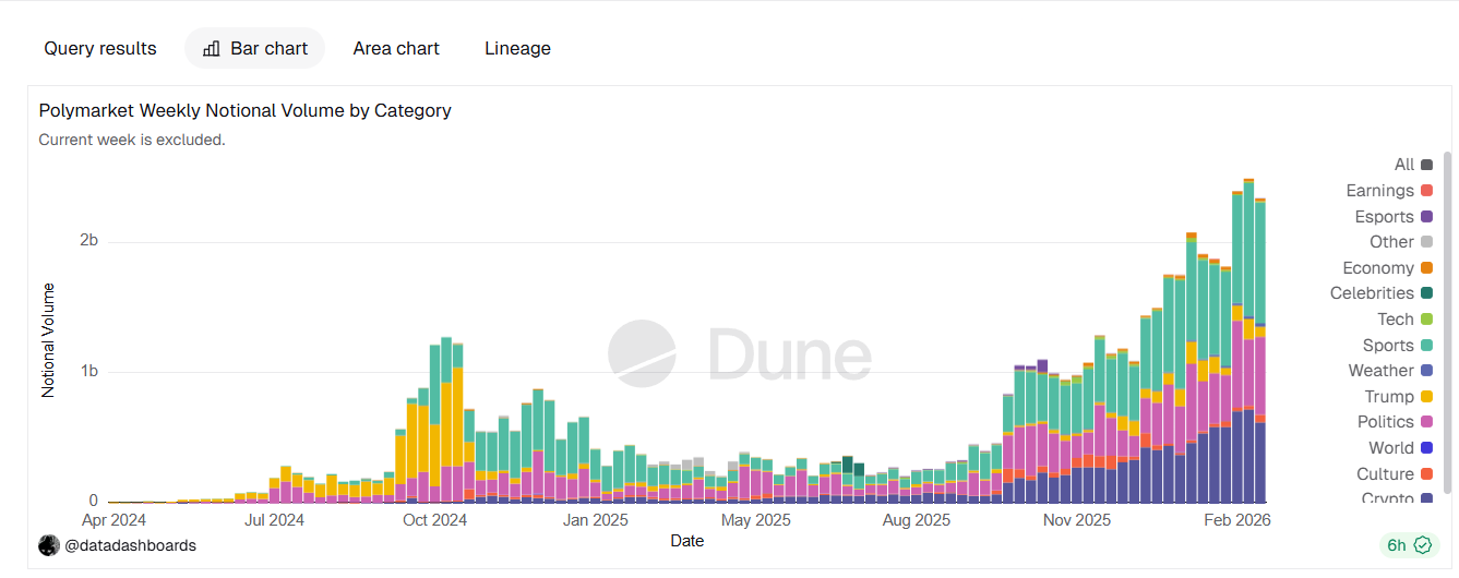 Prediction market activity has been rising since the beginning of the recent US and Israeli military conflict with Iran. Politics-related contracts soared to become the third-largest category on Polymarket at $598 million and the eighth-largest on Kalshi with $16 million, based on last week’s notional trading volume seen on Dune.