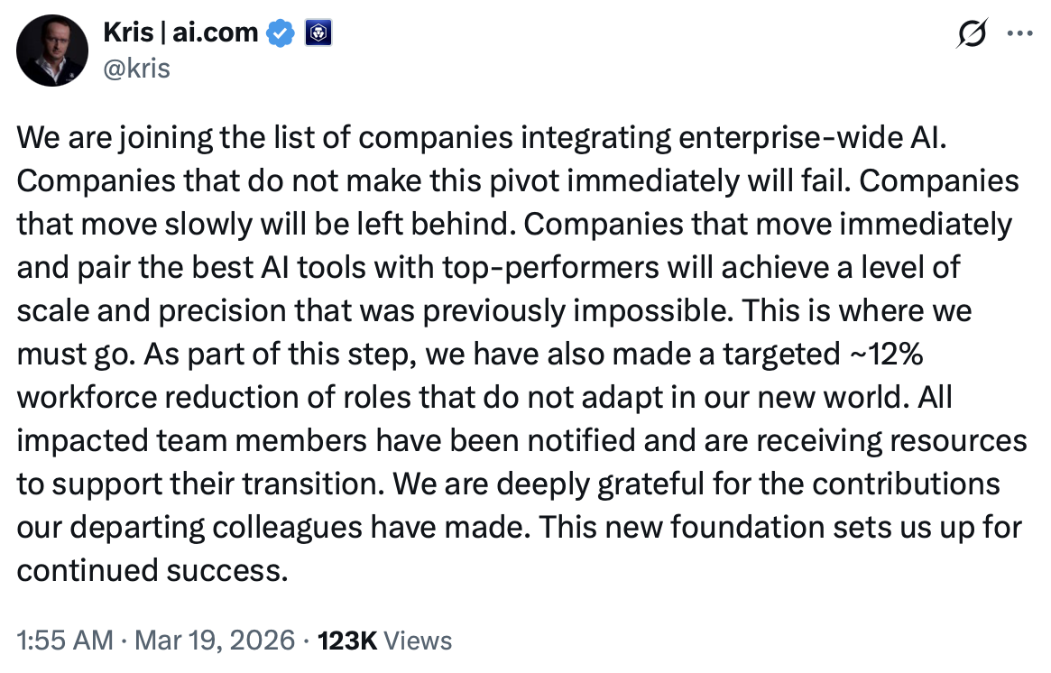 The trend continued this week, with Crypto.com saying it plans to cut up to 12% of its workforce as it integrates AI across its operations. On Thursday, CEO Kris Marszalek warned on X that “companies that do not make this pivot immediately will fail.”