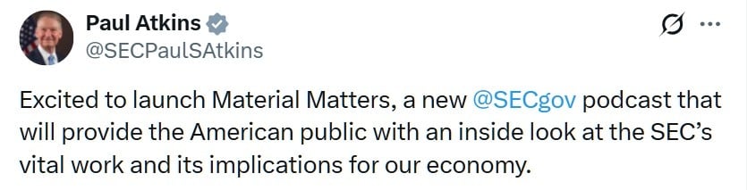 Atkins announced the launch of the Material Matters podcast on social media platform X, describing it as a new SEC initiative designed to give the public greater insight into the agency’s work and its broader economic impact. In the episode, he emphasized crypto as a top priority, stating: