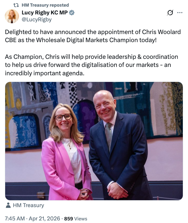 The Treasury also named former Financial Conduct Authority veteran Chris Woolard as digital markets champion for its Wholesale Financial Markets Digital Strategy, where he will support efforts to drive adoption of tokenized digital assets.