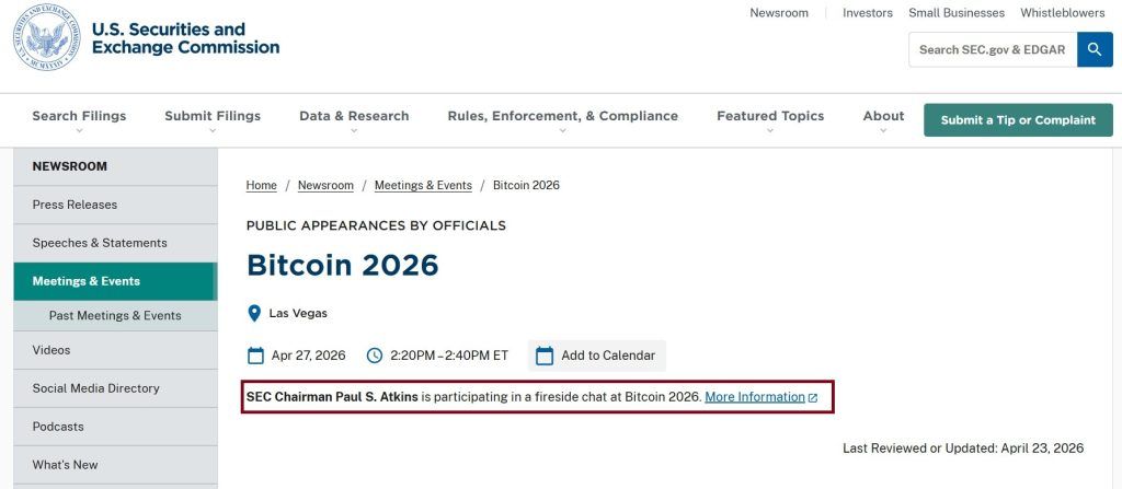 - SEC Chair Paul Atkins is set to address the attendees of Bitcoin 2026 in Las Vegas on April 27.