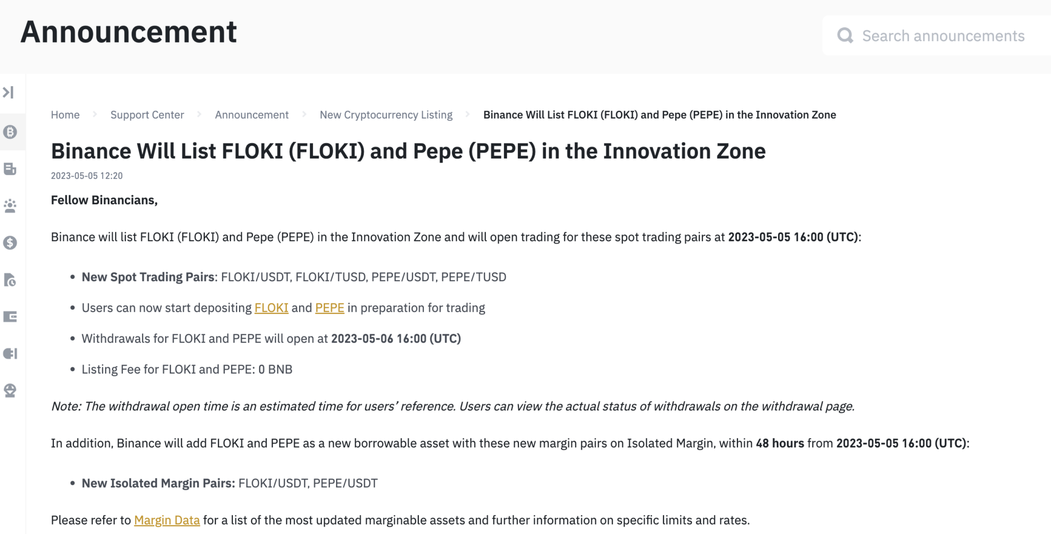 Furthermore, the exchange revealed that it plans to also allow borrowing on both of these assets. The new margin pairs for FLOKI and PEPE will be available on Isolated Margin and Binance plans to add both of these in the next 48 hours. The Isolated Margin pairs include FLOKI/USDT and PEPE/USDT.