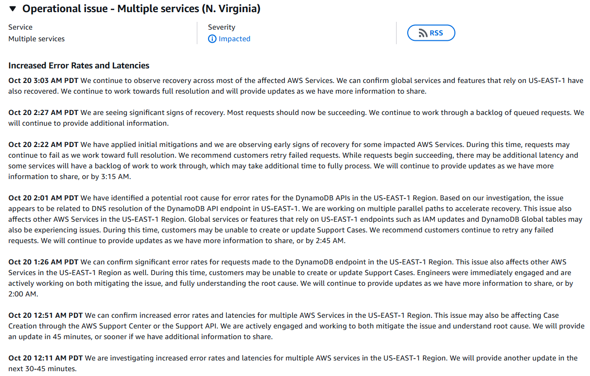 “We can confirm global services and features that rely on US-EAST-1 have also recovered. We continue to work towards full resolution and will provide updates as we have more information to share,” wrote AWS in a Monday update, about three hours after the outage was first reported.
