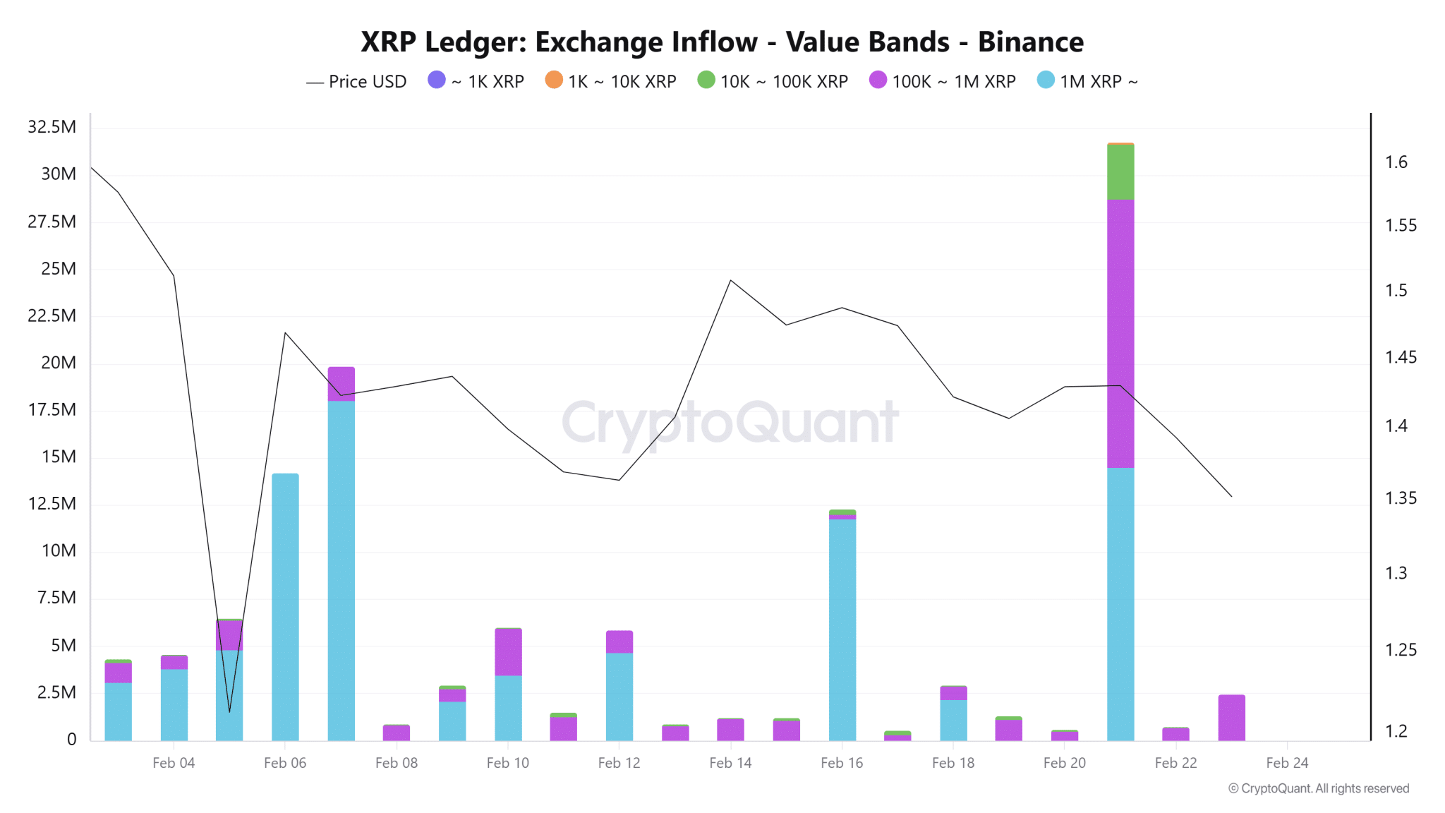 Notably, on Feb. 21, $XRP recorded 31 million tokens flowing into Binance, making it the biggest single-day inflow to the exchange this month, according to data provided by CryptoQuant, an on-chain analytics resource.