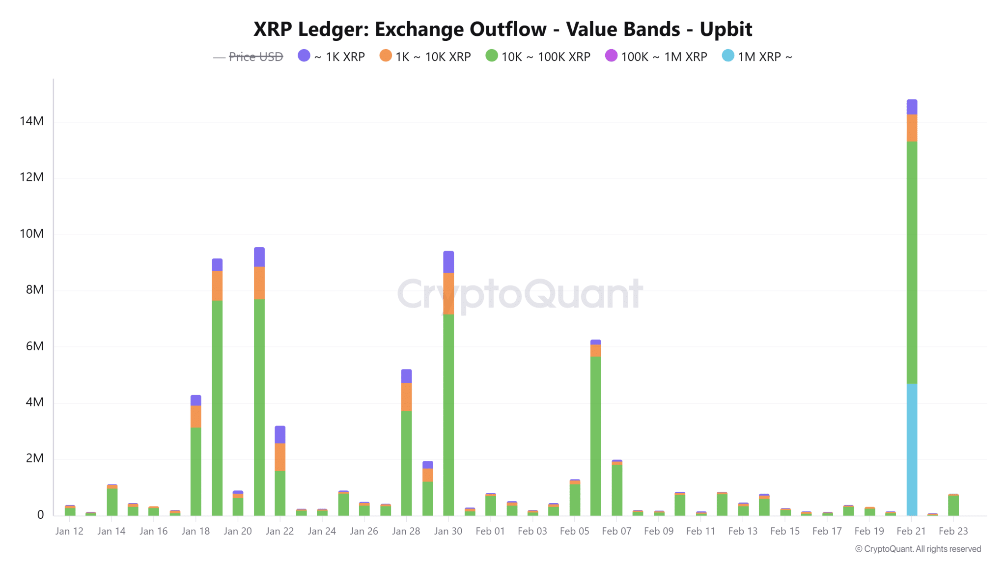 Interestingly, the Feb. 21 inflow spike was not limited to Binance. Upbit, the largest crypto exchange in South Korea, also recorded a sizable inflow on Feb. 21, though it was much smaller than Binance’s figure. Specifically, Upbit saw 14.8 million $XRP flow into the platform that day.