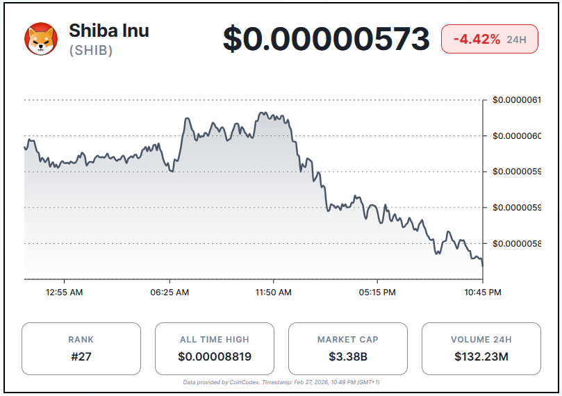 Friday's withdrawal adds to a growing body of data suggesting that some participants continue to accumulate $SHIB despite persistent price weakness. At the time of writing, Shiba Inu trades at around $0.00000573, down 4.42% in the last 24 hours.