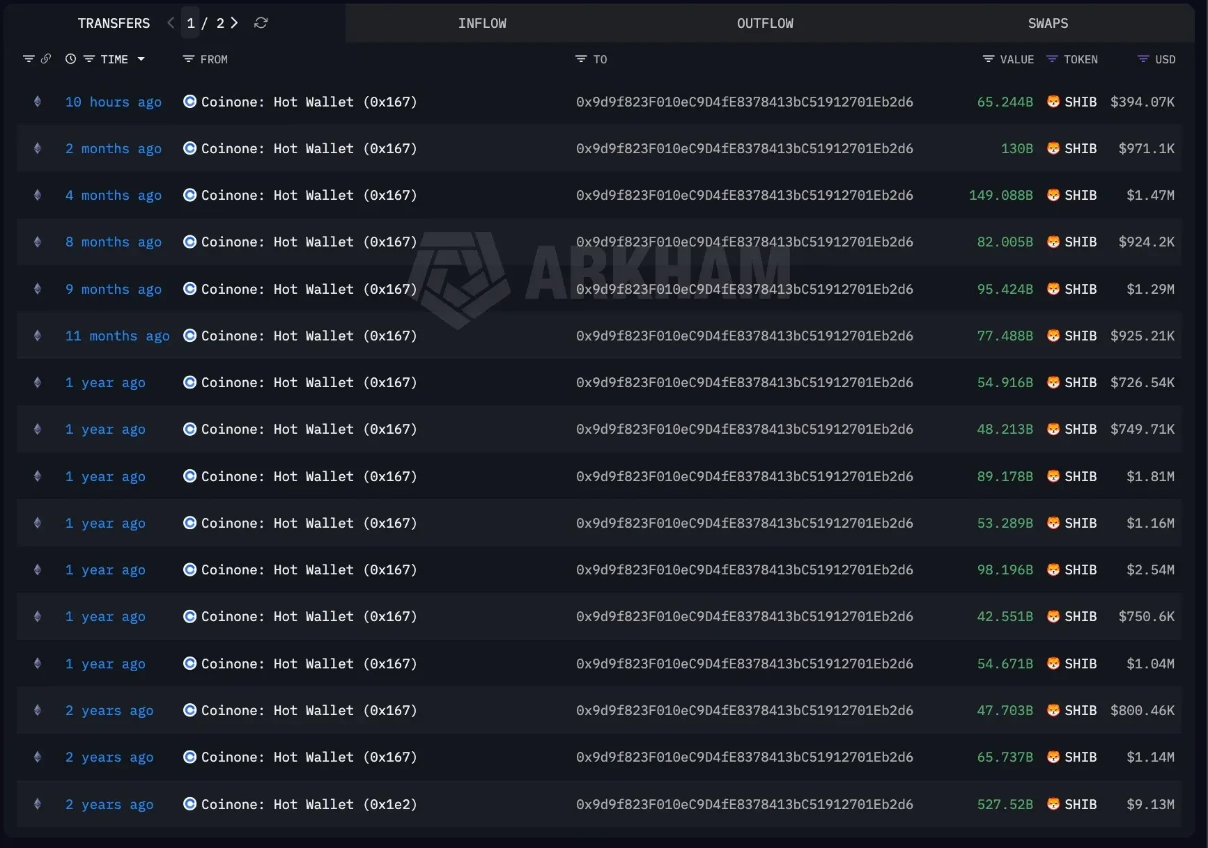 What makes this wallet stand out is not the size of the withdrawal alone. It is the pattern behind it. Over the past two years, every single transaction linked to this address has followed the same template: a withdrawal of $SHIB from CoinOne. No deposits. No trades. No interaction with any other token or exchange.