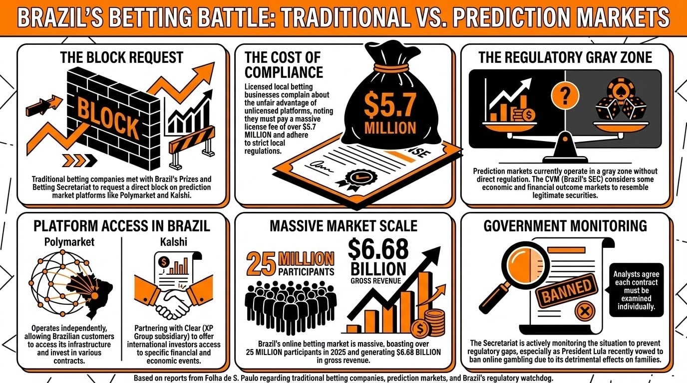 Betting companies have reportedly asked regulators to pause the operations of prediction market platforms, such as Polymarket and Kalshi, in Brazil. The betting lobby argues that prediction market contracts constitute bets and should be blocked, as these platforms are unlicensed in the country.