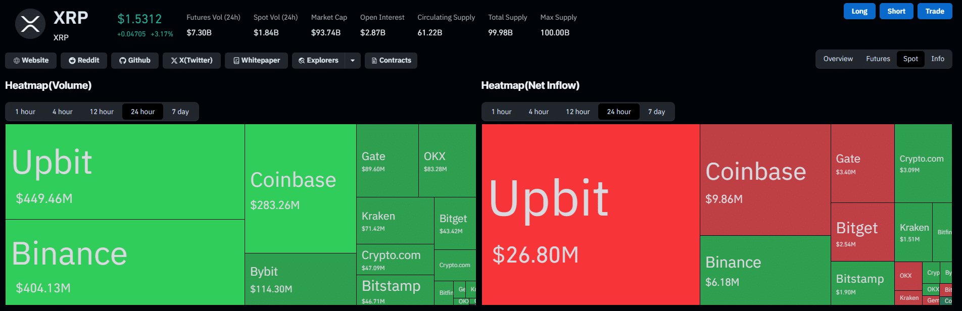 Coinglass data further breaks down the source of this strong market participation. Per the analysis, South Korea’s largest crypto exchange, Upbit, has dominated the volume heatmap in the past 24 hours. The platform accounts for $449.4 million of the total volume, after marking a 131.6% uptick in $XRP-tied spot trading activity in the past day.