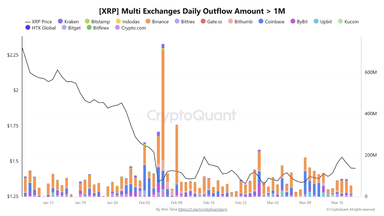 A report from CryptoQuant shows that high-value outflows dominate recent activity, with Binance acting as the main hub for these movements. Specifically, the metric tracking withdrawals above 1 million $XRP shows a steady rise in large transfers.