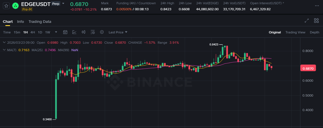 The token is already changing hands ahead of the official launch, with pre-market trading opening on Binance on March 19. EDGE is trading around $0.70, implying a fully diluted valuation of roughly $700 million.