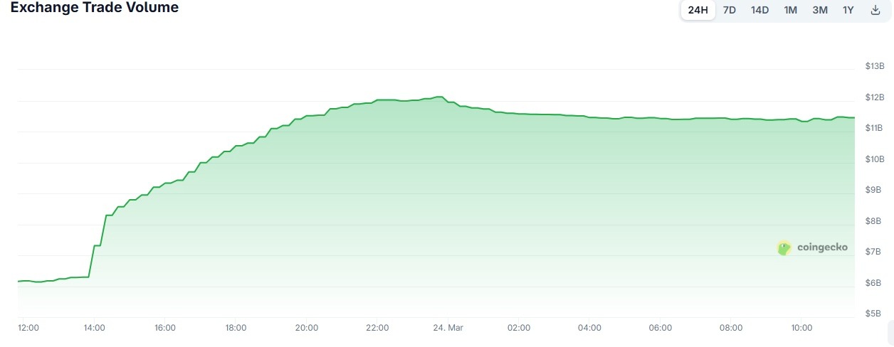 Binance’s market leadership coincides with a period of strong bullish momentum. During the 24 hours to press time, total exchange trade volume surged from approximately $6,154,645,988 to $11,447,143,379, an increase of 85.99%.