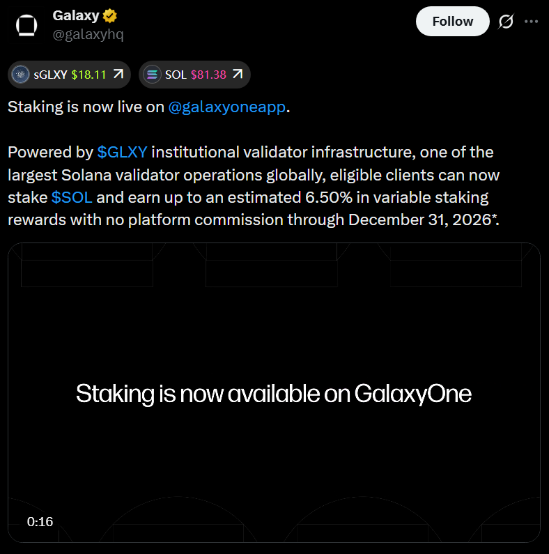 In a Tuesday announcement, Galaxy said GalaxyOne users can now stake Solana (SOL) directly through the app, earning up to 6.5% in variable annual rewards. The yield is not fixed and depends on network conditions, validator performance and overall staking participation, meaning actual returns may fluctuate over time.