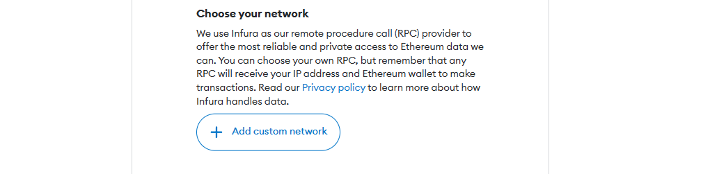 Under the new version of Metamask extension, labeled “10.25.0,” users are prompted with the option to use an “advanced configuration” during setup. Choosing this option reveals a number of settings that can be configured, including one that allows the user to choose a different RPC node than the default Infura one.