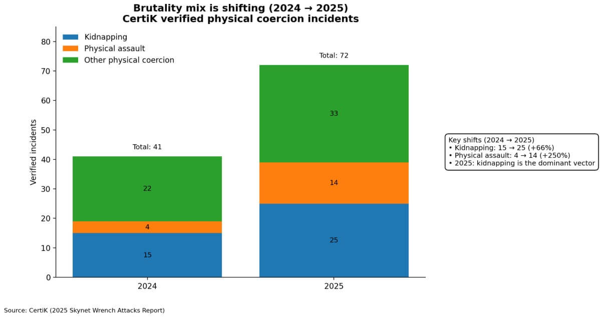 CertiK's 2025 Wrench Attacks Report logged 72 verified physical coercion incidents globally, a 75% increase over 2024, with confirmed losses exceeding $40.9 million.