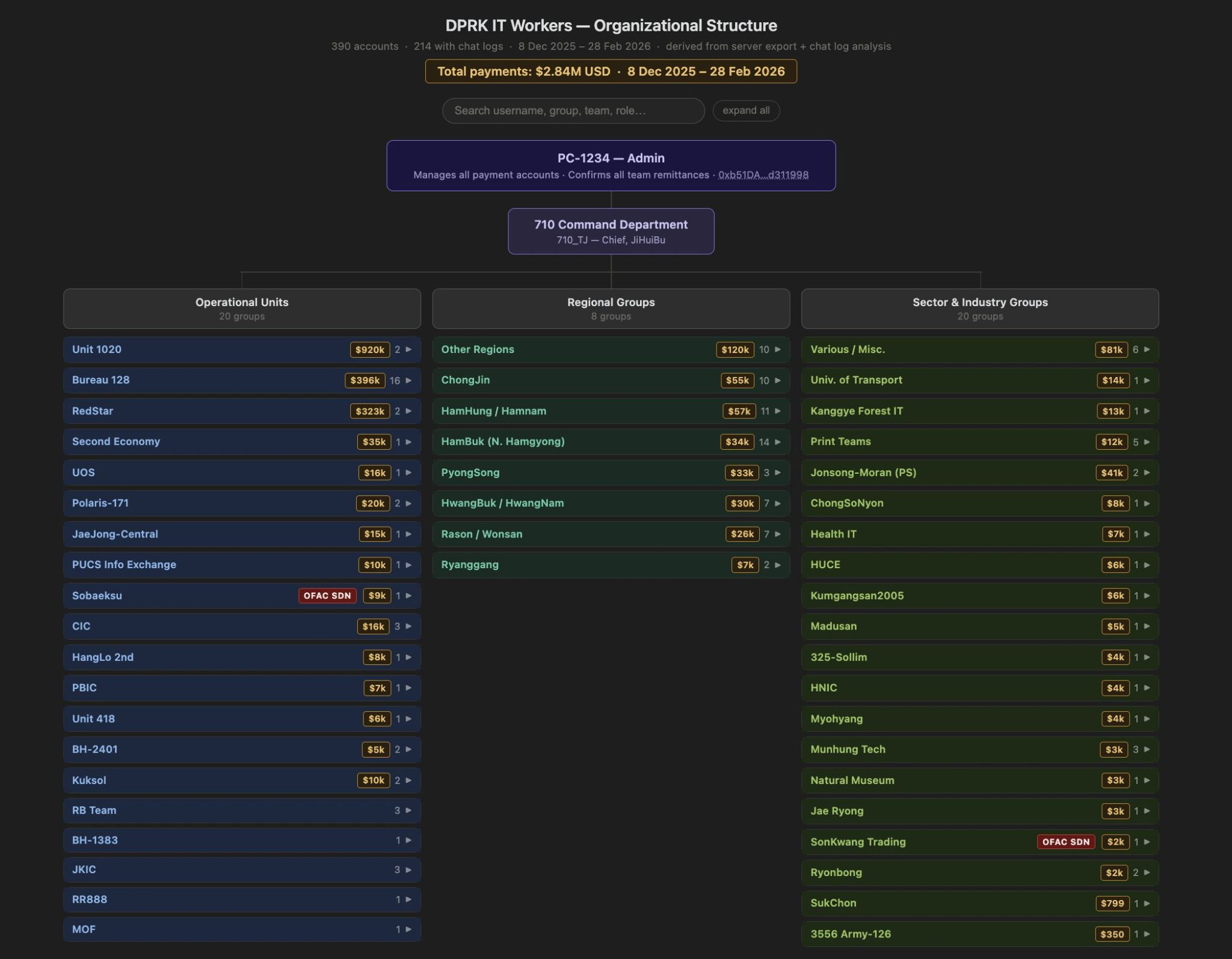 The North Korean IT workers coordinated payments on a website called “luckyguys.site” using a shared password, “123456,” ZachXBT said, adding that some of the users on that platform appeared to work for Sobaeksu, Saenal and Songkwang, which are sanctioned by the US Office of Foreign Assets Control.