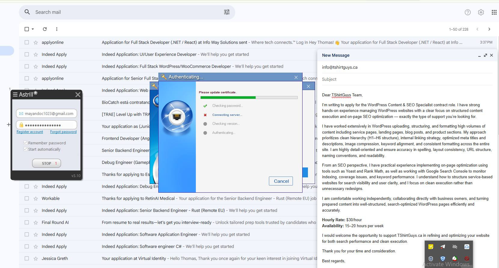 Another screenshot shared by ZachXBT showed that Jerry used an Astrill virtual private network to access Gmail, where he submitted several applications for full-stack developer and software engineer roles on Indeed.