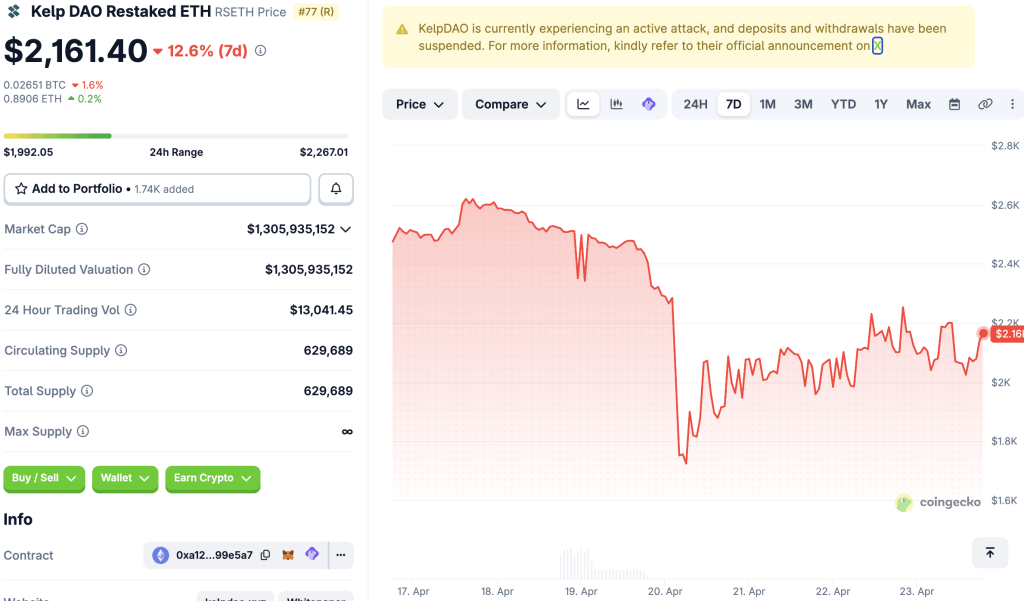 April 23 marked the third straight day KelpDAO’s liquid restaked token (LRT), rsETH, failed to maintain its peg to ether ( $ETH). However, Coingecko data shows that rsETH, which traded at a premium until April 20, has narrowed the gap with $ETH to between $150 and $200. Shortly after a KelpDAO breach by suspected North Korea-backed hackers, rsETH plunged from $2,404 to $1,723. In contrast, $ETH stood at $2,270 at the time, a difference of more than $540.