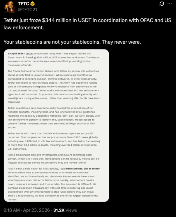 The reaction reflects a tension that has existed since centralized stablecoins became widely used — the tokens may sit on a blockchain, but the company behind them holds a master switch.