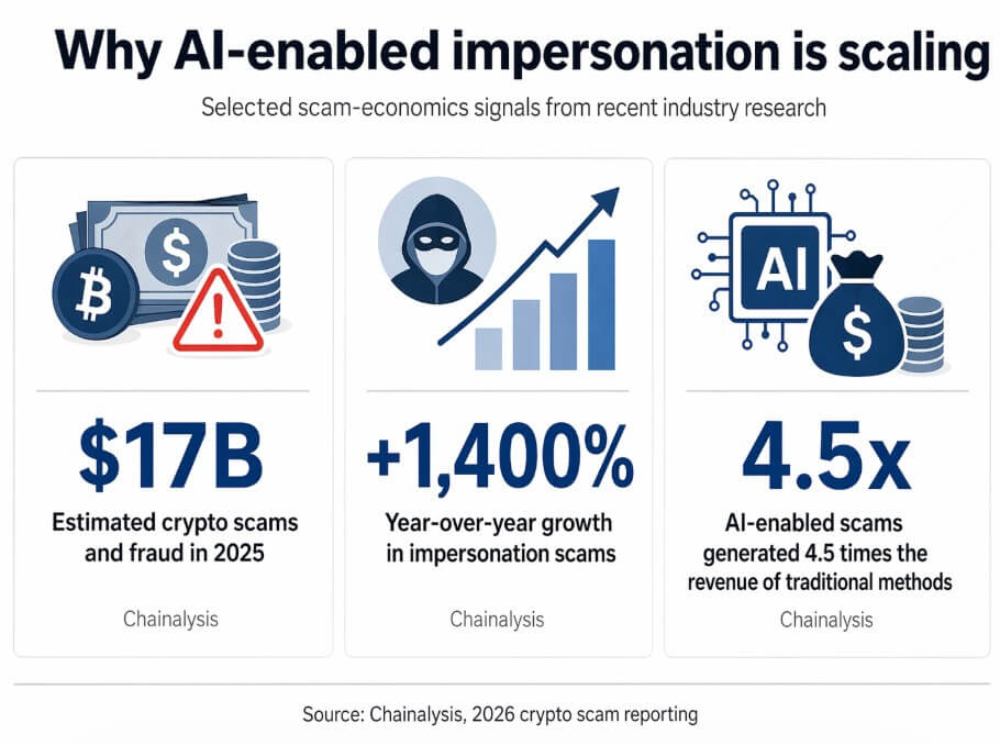 Chainalysis estimated that crypto scams and fraud reached $17 billion in 2025, with impersonation scams up 1,400% year over year and AI-enabled scams generating 4.5 times as much revenue as traditional methods.