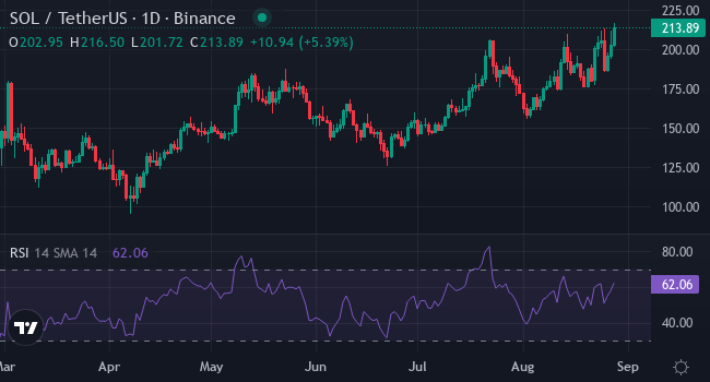 Неделя началась с того, что Solana отскочила от $184 к $220, показав рост на 13,5%. Индикаторы импульса поддерживают движение: RSI находится на уровне 64,48, стохастик — около 79. Оба значения указывают на устойчивый спрос, но без выхода в экстремальные зоны. 10-дневная скользящая средняя на уровне $212 формирует краткосрочную поддержку в текущем диапазоне.