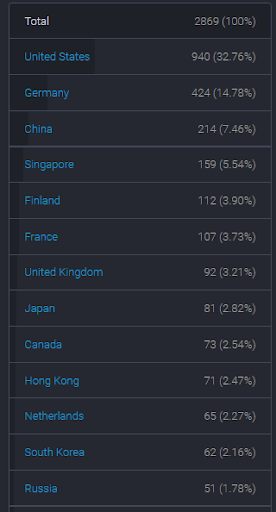 По состоянию на 31 октября насчитывалось 3025 узла эфириума, что на 14,55% меньше, чем на предыдущей неделе. В частности, в США насчитывалось 1007 узлов, 463 узла в Германии, на каждый из которых приходилось 33,29%,15,31% от общего числа узлов соответственно.