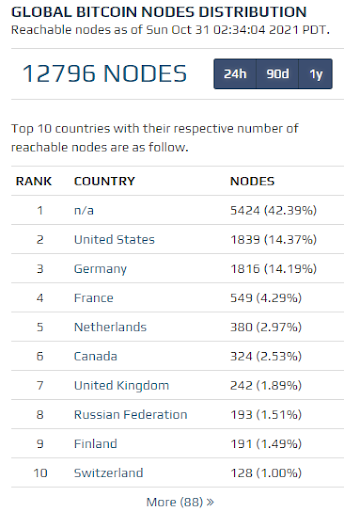 За неделю количество узлов в биткоине снизилось на 9,53%, а количество узлов в эфириуме уменьшилось на 14,55%. По состоянию на 31 октября насчитывалось 12796 узла биткоина, из них 1839 узлов в США, 1816 узлов в Германии, и 193 узлов находятся в России, на долю каждого государства приходилось 14,37%, 14,19% и 1,51% от общего числа узлов биткоина соответственно. Россия занимает 3 место в рейтинге по количеству узлов, потеряв одно место в рейтинге по сравнению с прошлой неделей.