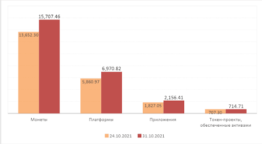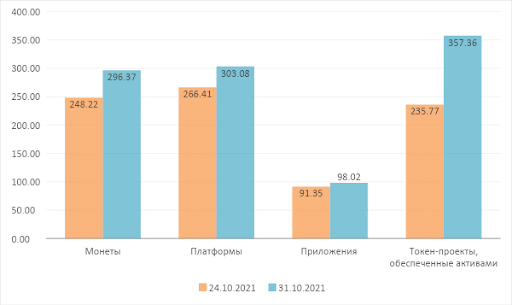 В сегменте 100 ведущих криптовалютных проектов наибольшее снижение общей рыночной капитализации у проектов приложений. По состоянию на 31 октября общая рыночная стоимость проектов цифровых монет достигла $1570,7 млрд, увеличившись на 2,44%. Средняя рыночная стоимость проектов цифровых монет достигла $ 29,6 млрд, увеличившись на 4,38%.