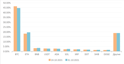 По состоянию на 31 октября биткоин торговался по цене $61318,96, что 0,67% выше, чем на прошлой неделе. Эфириум торговался по цене $4288,07, что на 4,98% выше, чем на прошлой неделе.