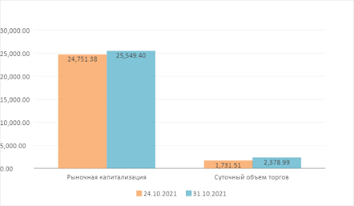 На неделе с 25 октября по 31 октября общий суточный объем торгов увеличился на 37,39% по сравнению с аналогичным периодом прошлой недели. 69 из 100 крупнейших проектов увеличили суточный объем торгов. Лидером по суточному объему торгов стал MANA с недельным ростом на 23458,64%. 31 проект снизил объем суточных торгов, 16 проектов снизили объем суточных торгов более чем на 20%, 4 проекта упали более чем на 50%. Антилидером стал проект RENBTC, снижение составило -79,41 %.