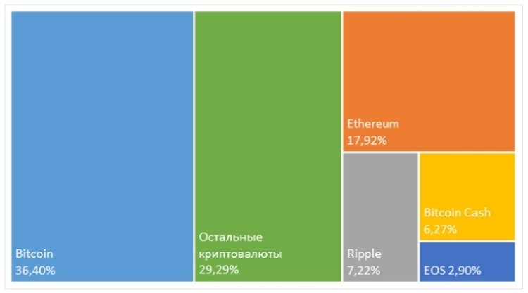 В структуре рынка значительных перемен не произошло. Доля биткоина немного выросла с 36,12% до 36,4%, Ethereum прибавил 0,68 п. п., однако Ripple сократил свою долю с 7,50% до 7,22%, а Bitcoin Cash – c 6,54% до 6,27%, EOS потерял 0,4 п. п.