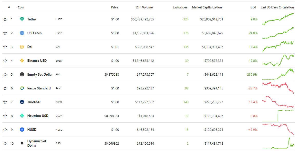 Ниже на скриншоте представлены топ 10 стейблкоинов по рыночной капитализации на конец 2020 года. Первые три из списка уже перешагнули объем в 1 млрд долларов, а популярнейший Tether (USDT) достиг объема 20,9 млрд долларов и занимает долю в 74%.