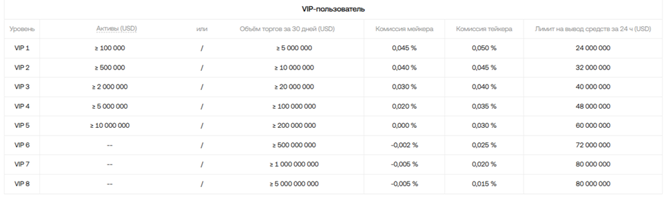 Наиболее активным трейдерам доступны VIP-уровни с нулевыми комиссиями и другими максимальными привилегиями, такими как лимит вывода до $80 млн в сутки, но для этого надо соответствовать определенным требованиям: