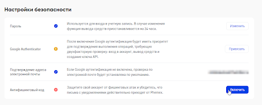 Безопасность аккаунта настраивается в личном кабинете. Для этого необходимо выбрать Аккаунт/Настройки/Безопасность. В появившемся меню рекомендуется включить двухфакторную аутентификацию 2fa и антифишинговый код: