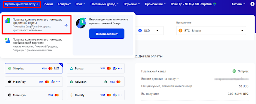 Биржа предлагает купить криптовалюту с помощью банковских карт. Процесс покупки выглядит следующим образом: