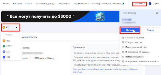 Нажать Активы / Депозит / Выбрать криптовалюту / Скопировать адрес / Отправить средства на адрес.